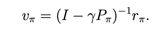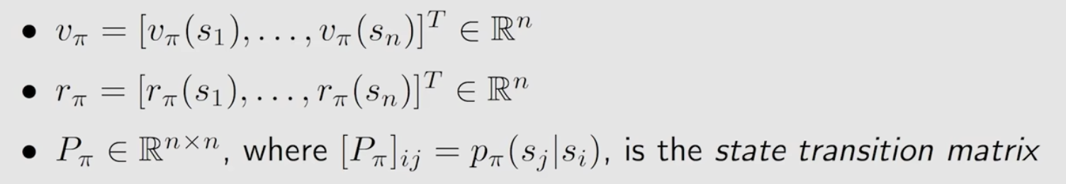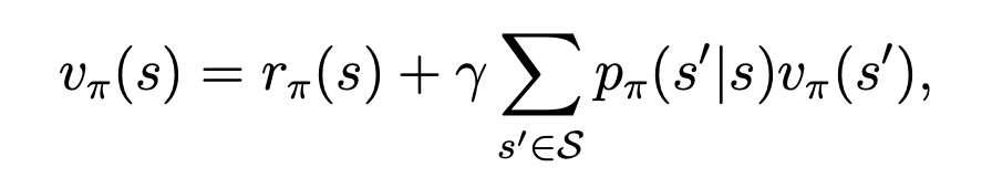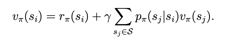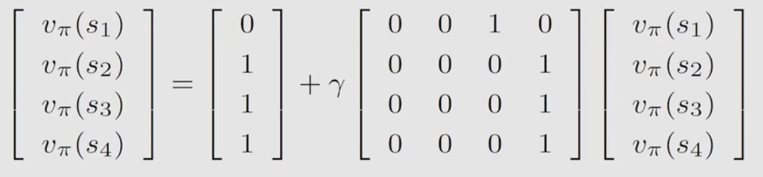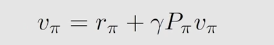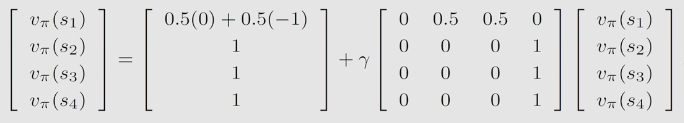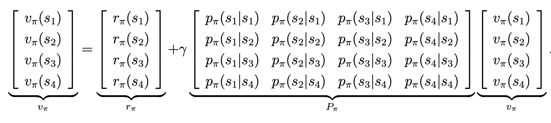 这里的未知量有2个,\(v_{\pi}(s)\)和\(v_{\pi}(s’)\). 一个式子是没法求出2个未知量的,但是因为对每一个状态都有一个式子,因此可以通过联立求得每一个状态的状态值。