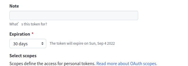 对note, expiration 和 scopes进行设置即可. note是你这个token的名字, expiration是这个token的有效时间, select scopes是这个token的作用范围, 如果都不选这个token就一点用都没有