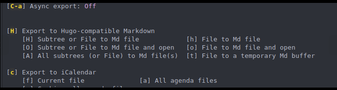 这时在org模式里就可以使用hugo了 C-c C-e时会多一个导出选项: