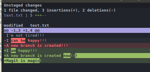 d d: 查看diff, 将text.txt文件中的内容修改, 并将光标移动到Unstaged changes中的 modified text.txt 这一行, 按两下d, 即可弹出 diff 相关内容, 弹窗如下: