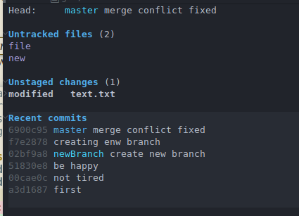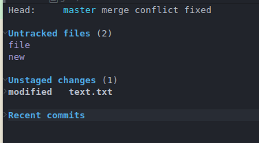 TAB: 折叠, 即如果光标在Untracked files这一行, 按TAB, 即可将UnTracked files这个小节给折叠起来, 工程文件多的时候这个功能十分管用. 下面是将Recent commits折叠后的结果.