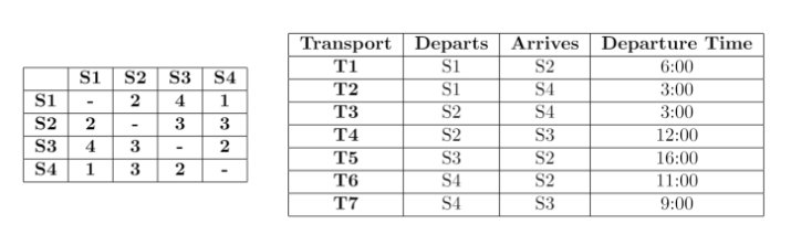 假设一个交通运输系统中有4个地铁站,站与站之间可达,交通时间表可确定。你需要做的是购买车票从而实现所有的运输。时间表如下: