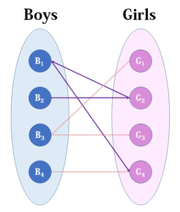 - 对于B4, 它只能与G4相连,但G4已与B1相连。B1除了G4,还可以与G2相连,但G2已与B2相连了,因此如果B4与G4相连了,B1就无法与别的节点相加,所以B4就无法匹配了。