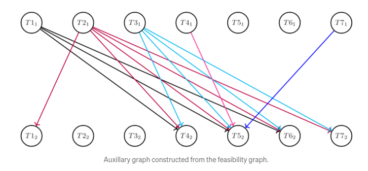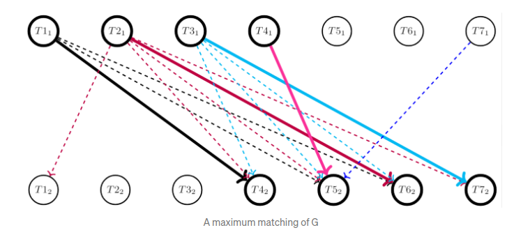 在以上二部图中查找匹配,假如找完最大匹配后某一个节点未到达,则需要单独为该节点购买一个车次的票以完成运输。因此最小化未到达节点的问题即是上图中的查找最大匹配的问题。而二部图的最大匹配问题是可以在多项式时间内完成的。