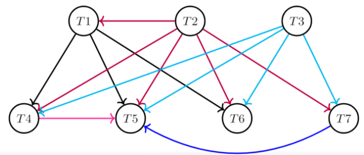 首先根据传输时间表构造交通图,因为车辆到达时间是不同的且有先后的,所以车辆换乘是有时间依赖的,据此构造图如下: