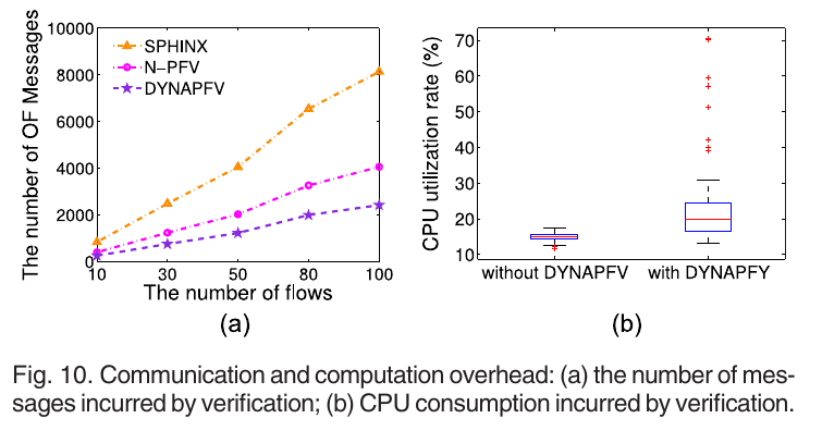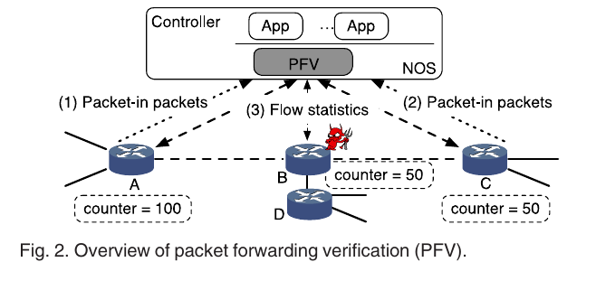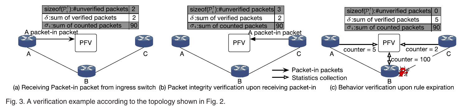 图2中的例子中,从A中进入的包会触发packetIn, 从C中出去的包也会.若最后2个PacketIn包相等则通过验证,否则让B生成PacketIn, 若此时相等则证明链路B-C安全. 若控制器中有rule过期则收集ABC的流表并比较. 如图2中可见B有恶意行为因为他的统计信息比A少. 若此时控制器中没有MAC过期则 packet hyjacking, 否则 dropping. 可见PFV可以有效地定位恶意交换机.
