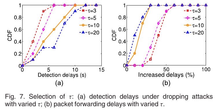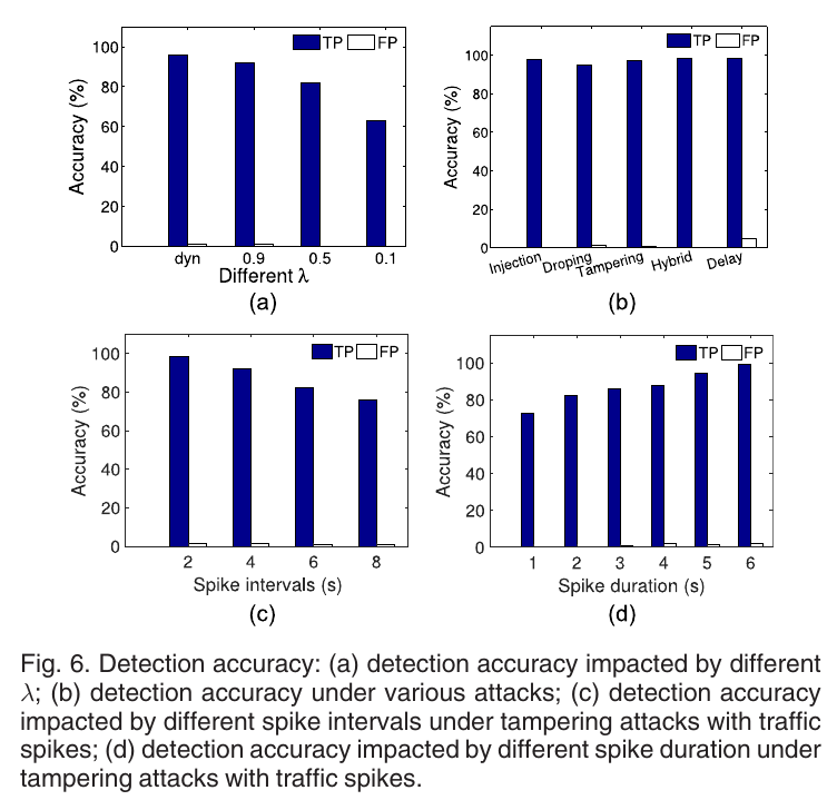 每个主机生成250个流并每秒共生成1000个包 Experiment A1: Detection Accuracy 见图6a:不同的触发概率, 不同的攻击, 不同的篡改间隔, 不同的篡改持续时间