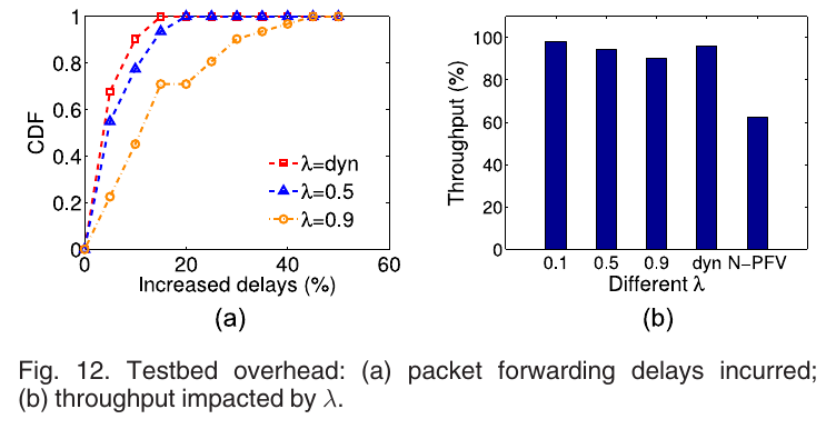 Experiment B.2: Overhead: 对包传输时迟的影响和吞吐量随\(\lambda\)的变化见图12: