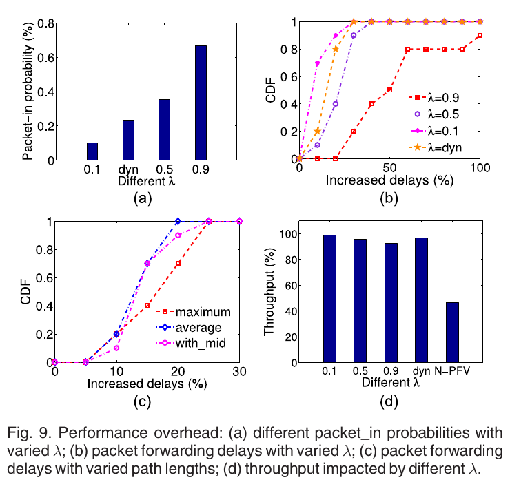 Experiment A.4: Overhead: 比较不同\(\lambda\)时packetIn的触发概率,导致的延迟和吞吐量的变化, 比较不同path长度时包的将会延迟, 检测结果如图9. 再没通信代价, 结果见图10