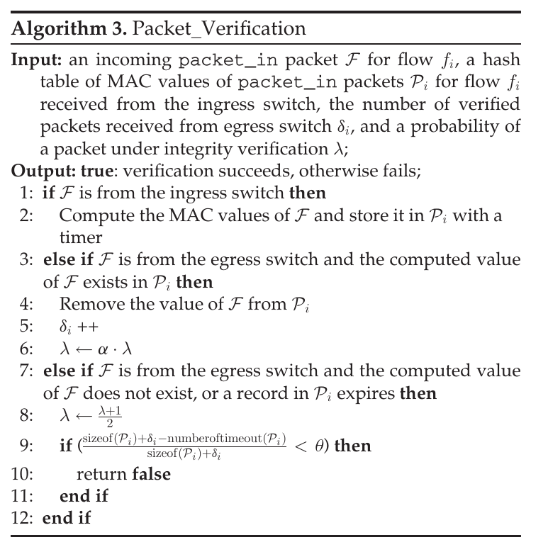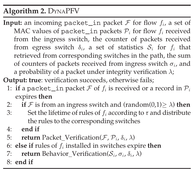\(N\)-PFV作为NOS的一个模块运行在控制器中, 算法 1 中1-12行为NFV验证包的完整性.