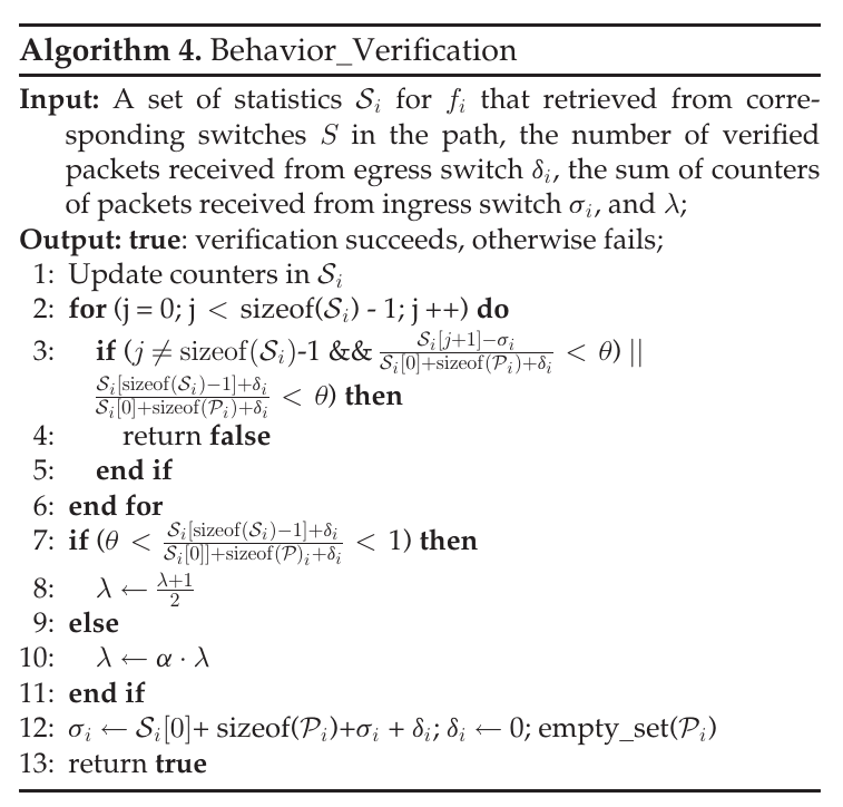 对path上的交换机处理的包进行统计, 并都与ingress交换机的统计结果求比值, 中间交换机直接统计, egress交换机则为统计结果加检查的包数\(S_i[0] + sizeof(\mathcal{P}_i + \sigma _i)\). 比值大于\(\theta\)但小于1则提高抽样概率\(\lambda\), 否则减小\(\lambda\). 最后清空\(\delta_i\)和hash表, 并更新\(\sigma_i\)