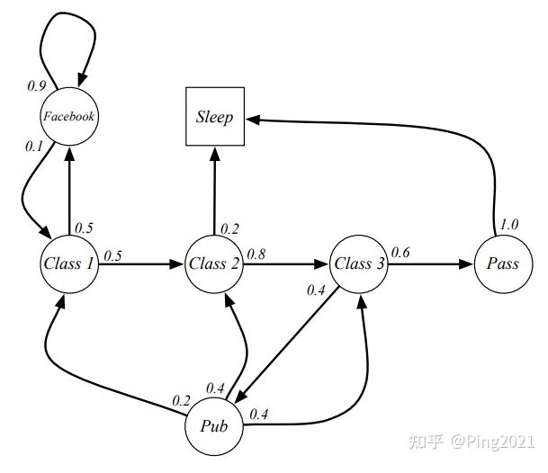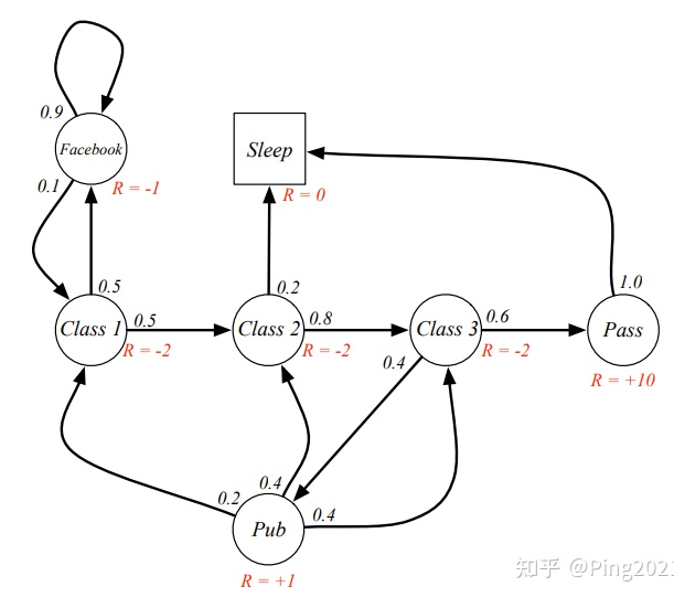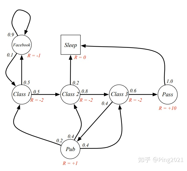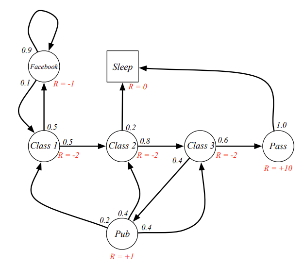 这里每一个球就是随机过程中的一个状态, 箭头表示状态转移, 箭头上的数字表示转移概率. 比如学生在Facebook这个状态, 那他有10%的概率会去Class 1 学习, 90%的概率会继续玩Facebook.