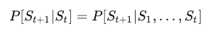 可以从这个式子里面看到, 下一个状态为\(S_{t+1}\)的概率只于当前状态\(S_t\)有关, 而与更前的状态\(S_1, S_2, …, S_{t-1}\)都无关.