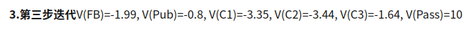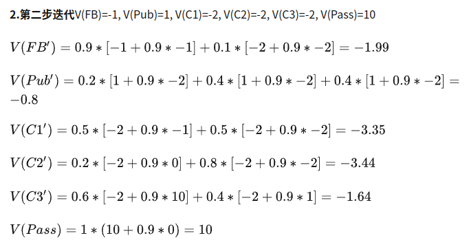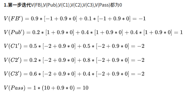 根据上面公式,进行迭代计算V值。各状态的初始V值都设0,算出各状态的后续状态的V(S’)值, 再将算得的V(S’) 作为下一个状态的初始值V(S).
