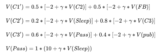 用上面的图举个例子, 假如学生当前在状态Class 1, 此时他即可能进入Class 2, 也可能进入facebook, 不管他下一个状态进入的是哪个, 他离开Class 1状态都会获得 -2 的奖励, 也就是进入下一个状态时, 会获得本状态的奖励.