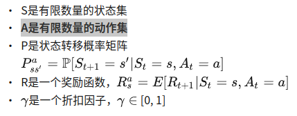 马尔可夫决策过程是在马尔可夫奖励过程的基础上加入了动作, 定义为: \(<S,A,P,R,\gamma>\)