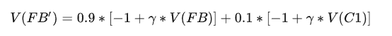 这个式子还是很好理解的,结合前面的例子,当前状态的收益为当前状态的价值+\(\sum\)下一个状态的转移概率X下一个状态的价值 X \(\gamma\). 可以用下面这个图形来解释:
