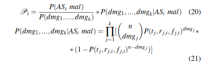 错误行为概率如式(20). k为中间AS节点个数. \(t_i\)为ASi的返回路径上的AS数, \(r_{j,i}\)为1若ASj在返回路径上. 对于每一个AS, 式(20)都是常量. 因此要算的是\(P(dmg_1, …, dmg_k | AS_i mal)\). mal表示malicious, n为源期待接收的响应包数.为定位恶意链路, 源最终需要计算所有的 \(P_{i+1}|P_{i}\) 并将最高Pi的ASi->ASi+1链路识别为恶意链路.