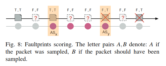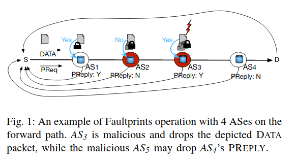 Faultpints使用 确定性采样来抓捕恶意AS.每个AS都要和源建立一个秘密数据包抽样密钥\(D_{AS_i, S}\), 且规定相应的确认包种类,如DACK. 如图1中所示, 源与目的通信, AS3是恶意的. 当AS抽样包时会存储一个数据包的fingerprint到 Bloom filter中, 这个fingerprint会捕获包的presence 和包的内容. 当包被丢弃那么D则不会发确认包,所以S会为这个数据包发探针, 所有的AS都会响应这个探针, 而源会从探针数据包中获得抽样包的信息. 源会检查响应包的密钥并对某些AS进行怀疑, 并为每个AS进行怀疑打分, 错误行为的AS的怀疑打分最终会高于其他AS.