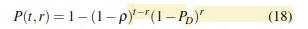 式(17)定义了良性AS和恶意AS的概率转移矩阵. \(P_D\)为恶意AS破坏一个响应包的概率. 良性AS破坏一个数据包与自然包率相同, 为\(\rho\). 利用该矩阵,一个正确数据包经过良性AS后保持正确的概率为\(1-\rho\), 经过一个恶意AS后保持正确的概率为\(1-P_D\). 因此当一条长度为r的链路有t个恶意AS时, 响应数据包保持正确的概率如式(18).