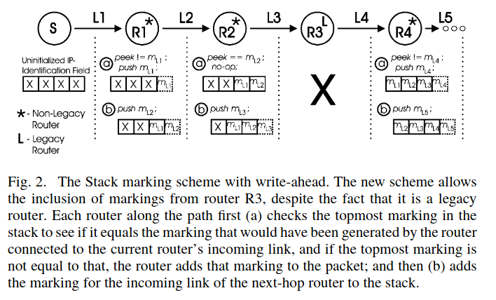 本文提出StackPi, 一种新的数据包标记方案以及一种过滤机制。标记方案由两部分组成:基于栈的标记以及write-ahead标记。过虑机制中我们推导出一个用Pi标记进行过滤的最佳阈值策略。还提出PiIP过度器可用于检测网络协议欺骗攻击。