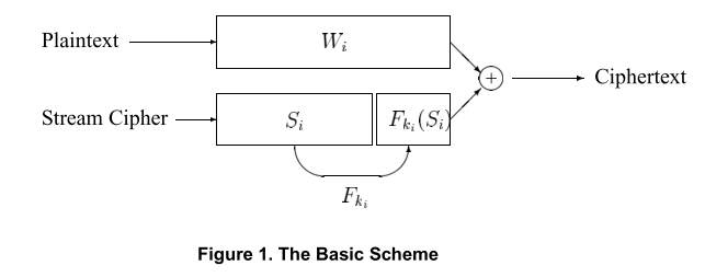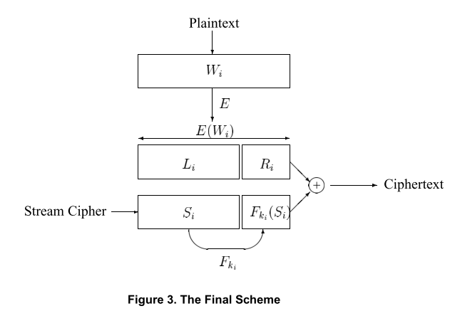 加密: 将预加密单词分成两个部分: \(X_i = <L_i, R_i>\). \(L_i\)为前n-m个比特位. Alice生成密钥: \(k_i := f_k’ (L_i)\). 解密时, Alice利用\(S_i\)与\(C_i\)的n-m位异或来恢复\(L_i\), 从而让Alice计算\(k_i\)并完成解密.